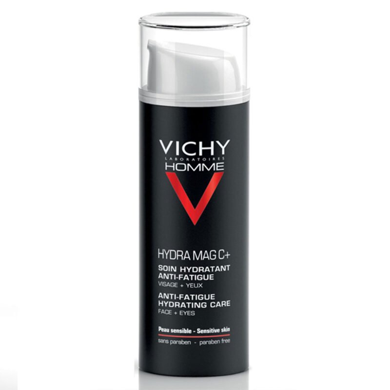 VICHY HOMME Hydra Mag C+ Soin Hydratant Anti-Fatigue recharge votre peau en énergie, atténue poches et cernes et aide votre épiderme à lutter contre les agressions. • Besoin : Peau déshydratée, teint terne, traits tirés, cernes et poches. • Ingrédients Clés : Vitamine C pour raffermir et donner de l'éclat au teint | Magnésium pour une action anti-fatigue | Dextran pour apaiser. • Sécurité : Hypoallergénique | Sans Parabène. • Utilisation : Appliquez matin et/ou soir sur une peau nettoyée. Visage.