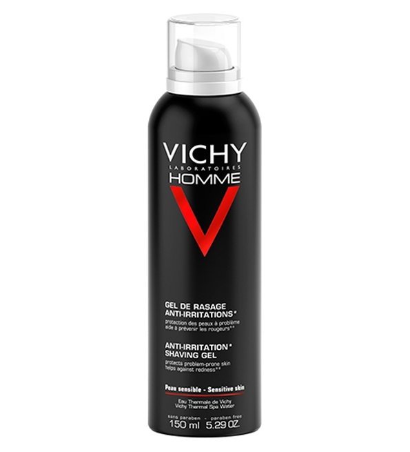 VICHY HOMME Gel de Rasage Anti-Irritations nourrit et apaise la peau tout en la protégeant efficacement, pour un confort optimal. • Besoin : Rougeurs ou irritations post-rasage | Peaux sensibles. • Ingrédients Clés : Calcium Dermo-Assimilable pour fortifier | Vitamine C Glucosylée pour protéger | Acide Salicylique pour prévenir les inflammations. • Sécurité : Hypoallergénique | Sans Alcool | Sans Parabène. • Utilisation : Appliquer sur une peau humide et nettoyée. Visage.