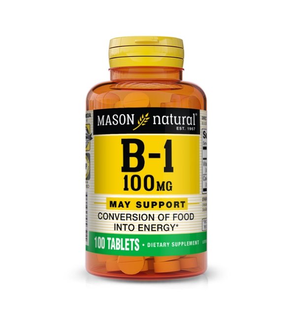 Mason Natural B-1 100 mg est un complément alimentaire riche en vitamine B1 (thiamine), essentielle pour le métabolisme énergétique, le bon fonctionnement du système nerveux et la santé cardiovasculaire. Boîte de 100 comprimés.